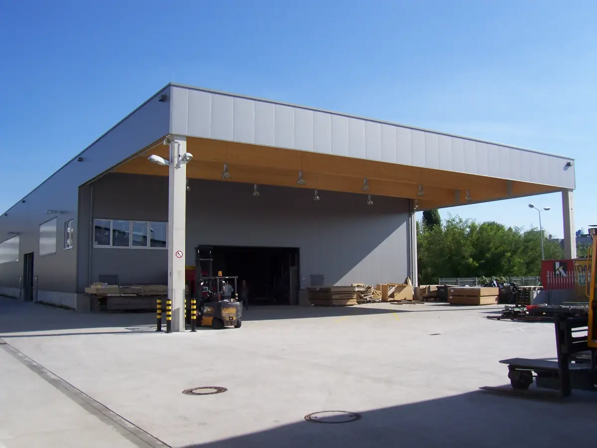 Das Objekt wurde wegen der Größe als Mischkonstruktion mit tragenden Bauteilen aus Stahlbeton und Holzbindern geplant und errichtet. Die Holzkonstruktion schafft auch die emotionale Verbindung zu den zu handelnden Baustoffen.