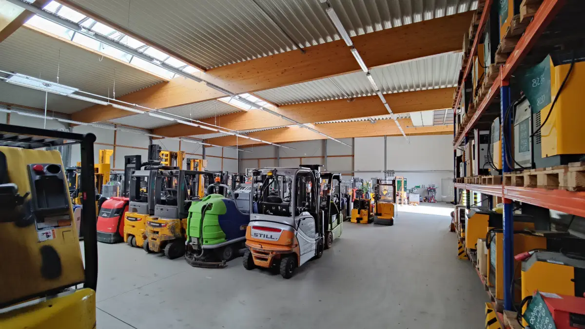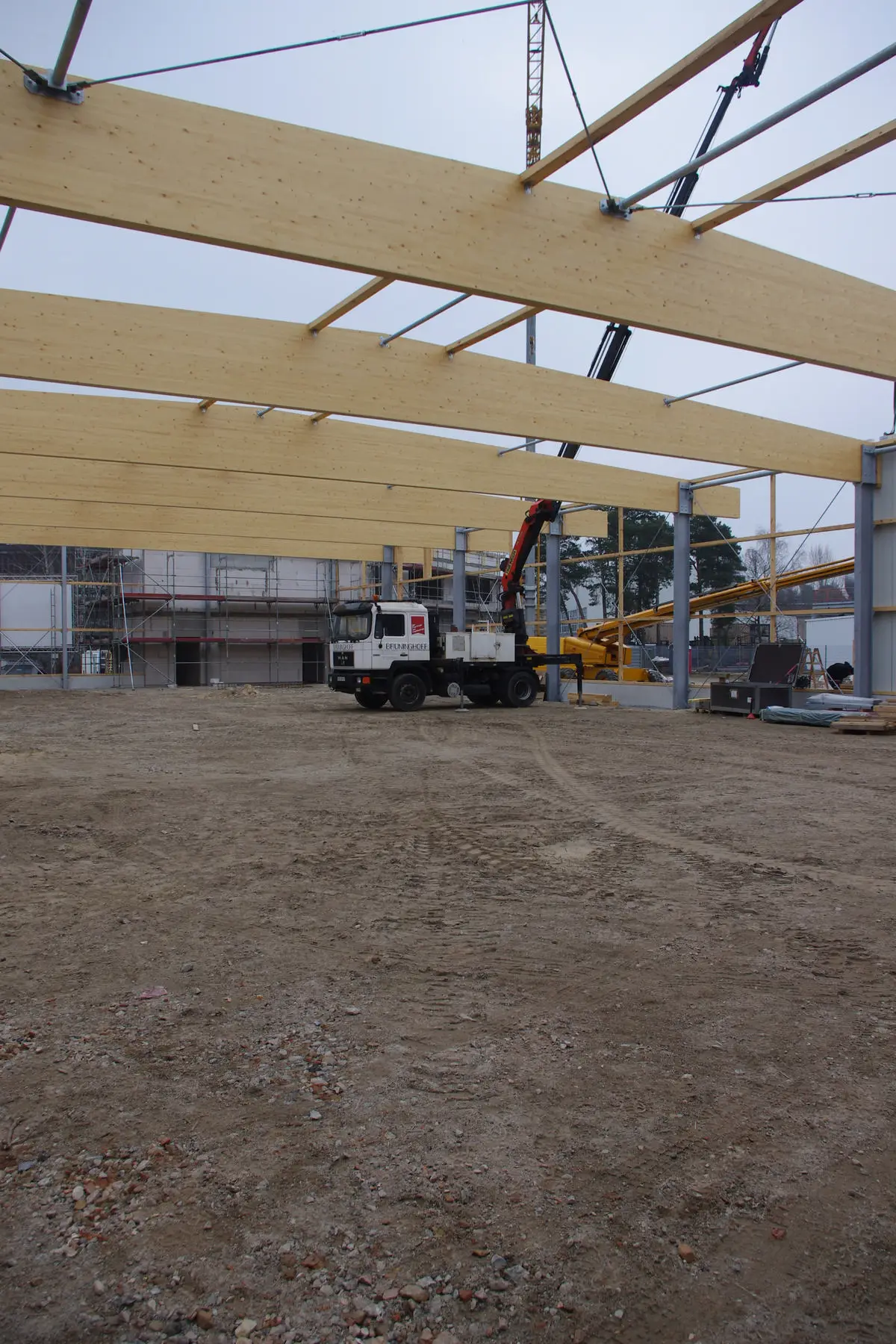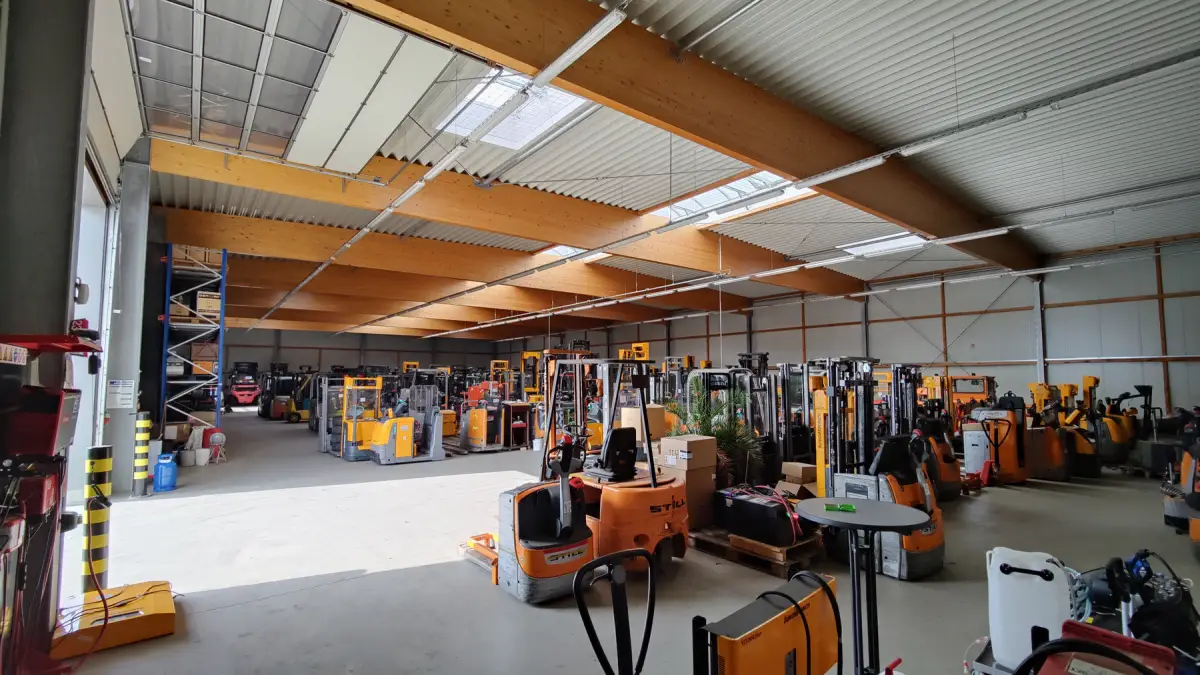Dazu wurde auf angrenzendem Grundstück ein massives, zweigeschossiges Bürogebäude mit freiem Grundriss neu geplant und errichtet, dazu eine neue Reparatur- und Präsentationshalle, die in Mischbauweise wirtschaftlich ausgeführt werden konnte. Das Dachtragwerk in Holzbauweise bietet neben Vorteilen beim Brandschutz auch eine ausgezeichnete Verkaufs- und Geschäftsatmosphäre.