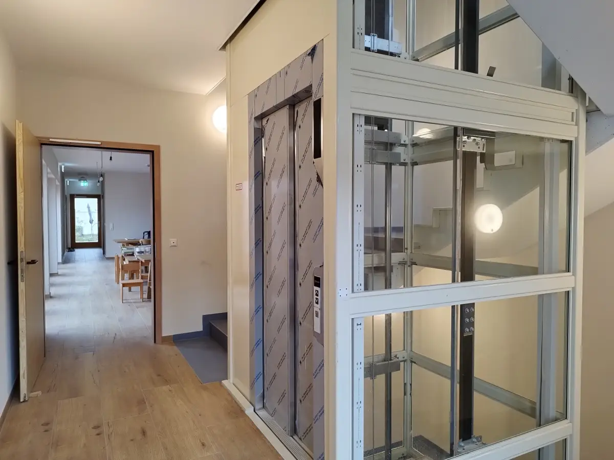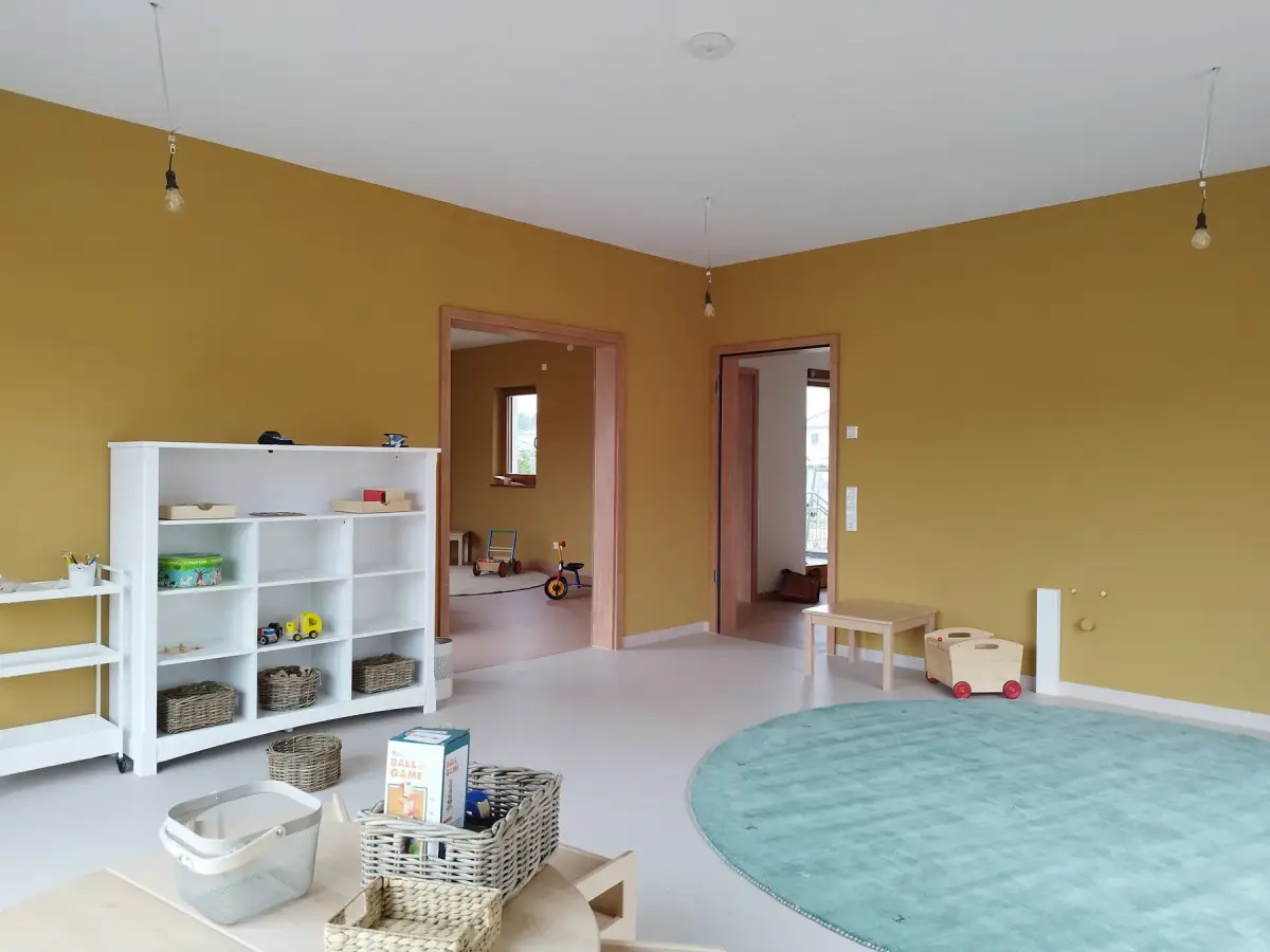 Der Kindergarten ist barrierefrei und besteht aus 3 Etagen, die über einen Aufzug verbunden sind. Die Räume unterscheiden sich in Farben und Texturen und können so leicht von Kindern erkannt werden, Beläge und Oberflächen sind in natürlichen Materialien gehalten.