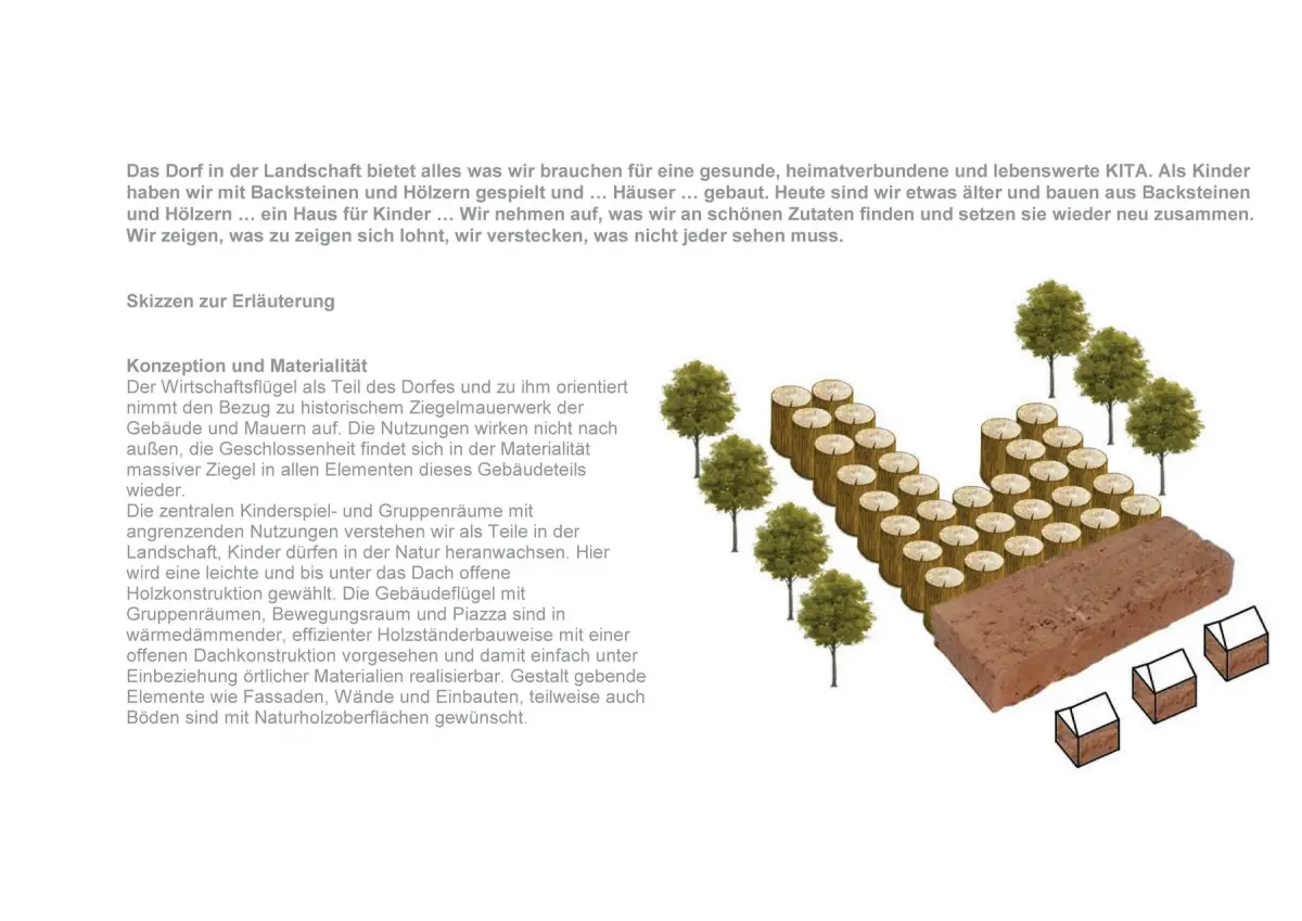 Das Dorf in der Landschaft bietet alles was wir brauchen für eine gesunde, heimatverbundene und lebenswerte KITA. Als Kinder haben wir mit Backsteinen und Hölzern gespielt und … Häuser … gebaut. Heute sind wir etwas älter und bauen aus Backsteinen und Hölzern … ein Haus für Kinder… Wir nehmen auf, was wir an schönen Zutaten finden und setzen sie wieder neu zusammen. Wir zeigen, was zu zeigen sich lohnt, wir verstecken, was nicht jeder sehen muss.