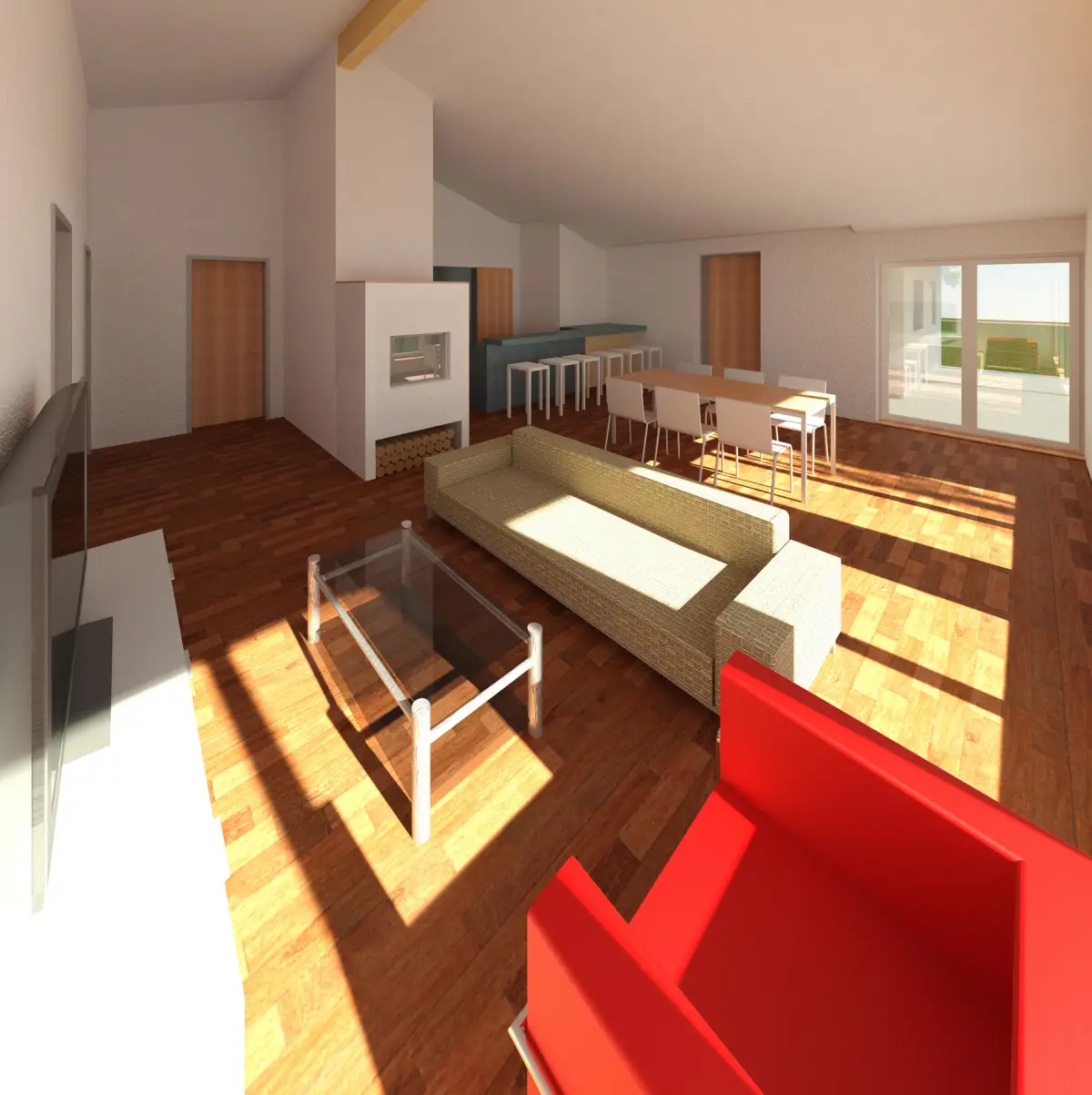Mit dem neuen Wohnhaus werden auf einer Ebene zur Landschaft orientierte, großzügige und offene Wohnräume geplant und realisiert. Die offenen, teilweise überdeckten Außenbereiche werden in die neue Planung integriert.