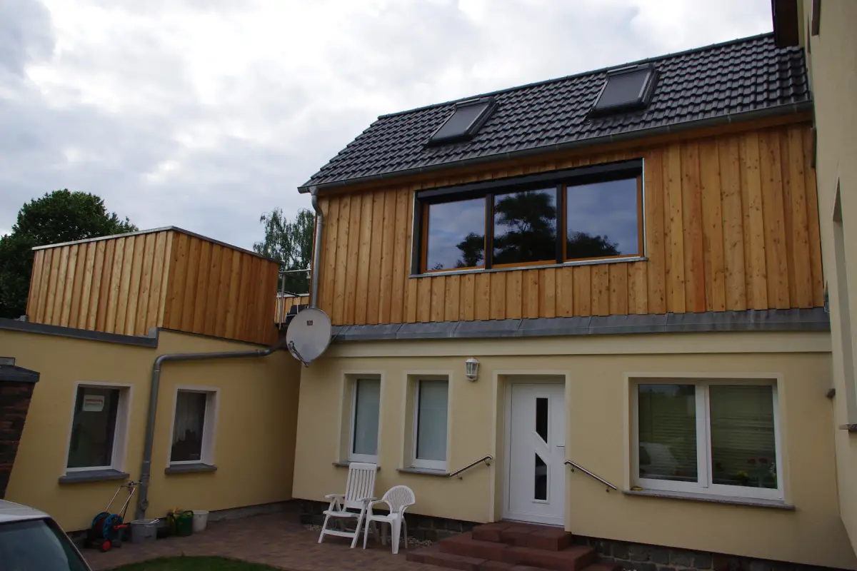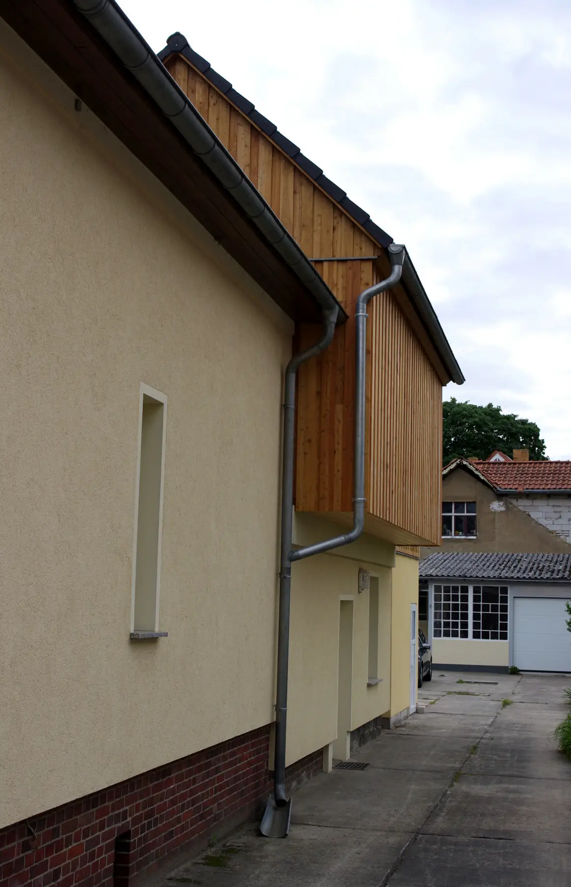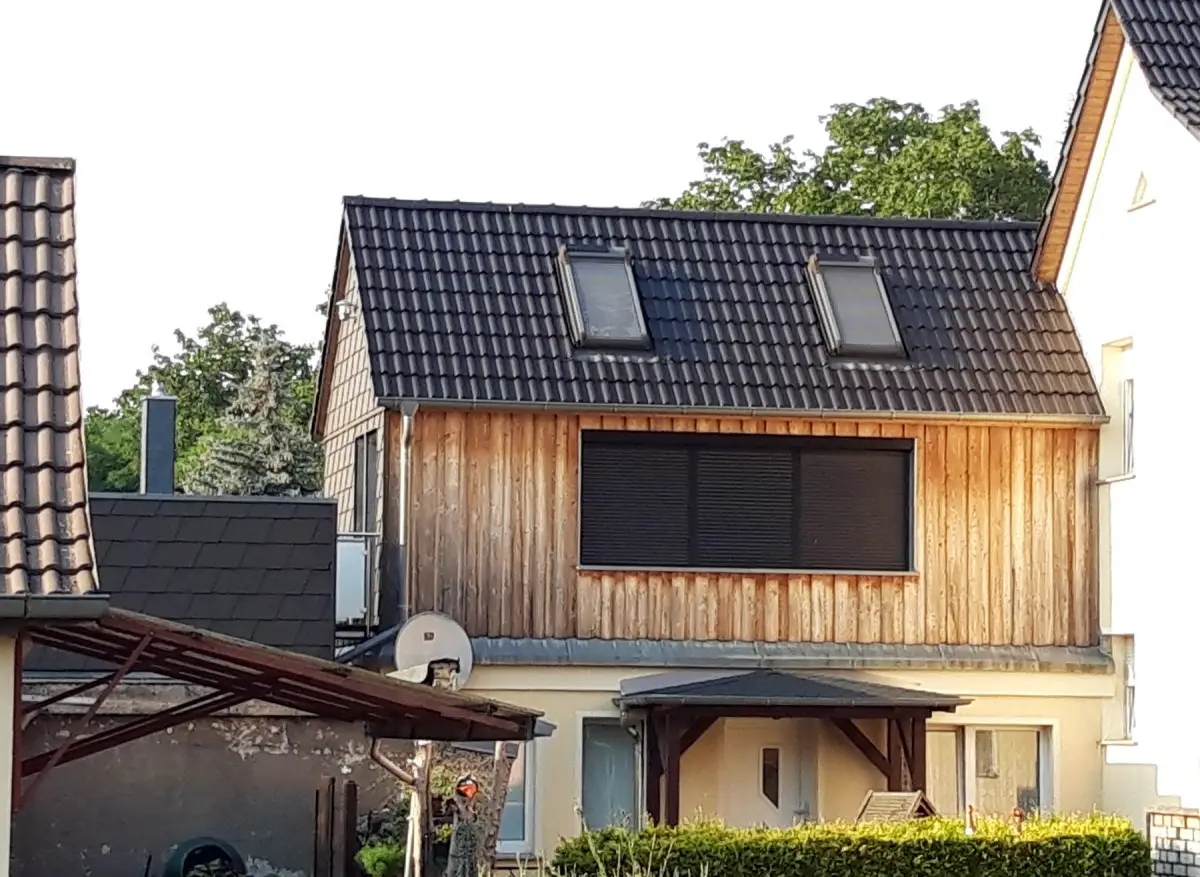 Dafür wurde der Eingangsanbau mit einem hölzernen Wohnraum überbaut, die Dächer von Bestands- und Neubau treten in einen gestalterischen Dialog. Der Eingang erhielt durch den seitlichen Überstand einen Wetterschutz, das neu entstandene, bis unter das Dach offene Wohnzimmer ist nach Süden orientiert und schafft neben dem erweiterten Raumangebot einen Zugang zu einer Dachterrasse und weiter zum Hof.