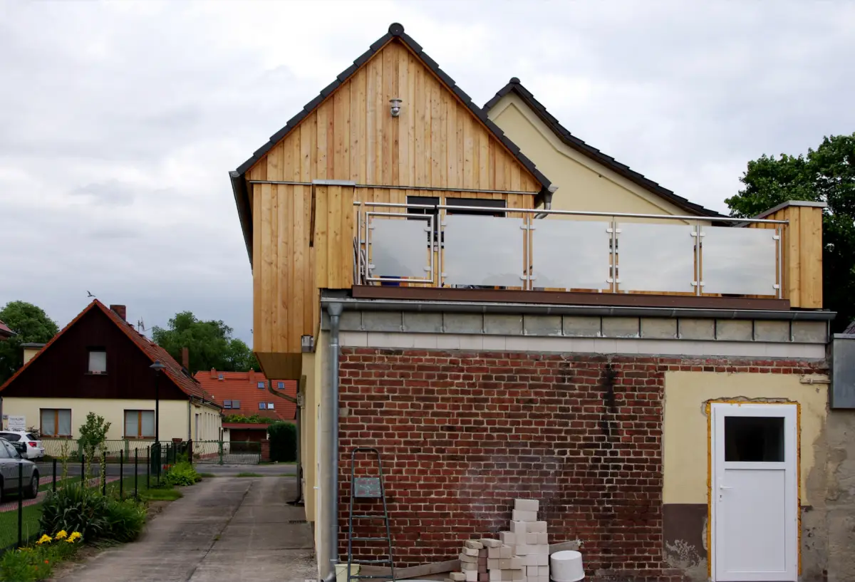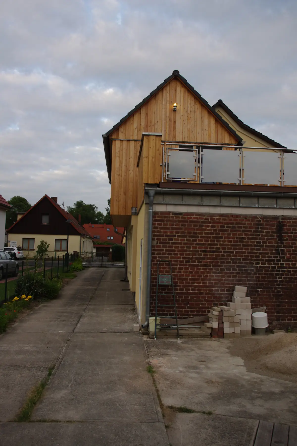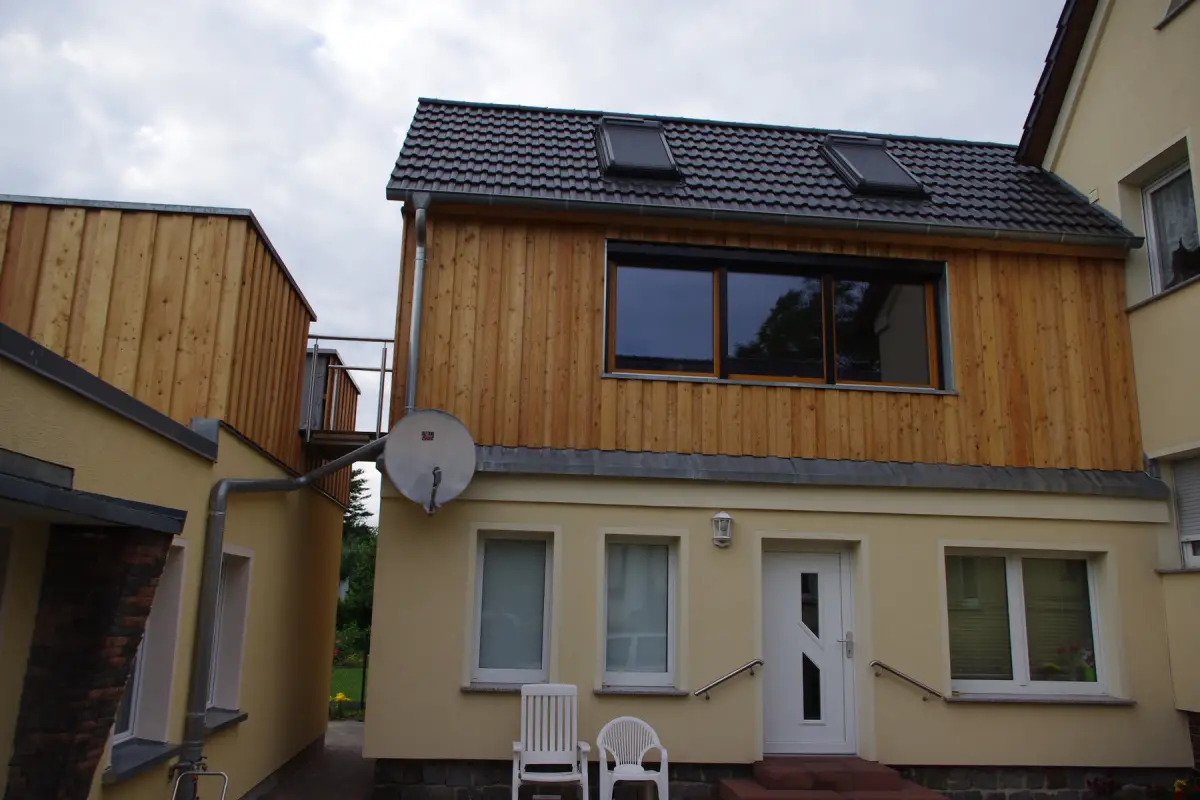 Bei einem Zweifamilien-Wohnhaus aus den 1930´er Jahren mit Eingangs- und Werkstattanbauten war für die im Dachgeschoss liegende Wohnung ein zusätzlicher Wohnraum erforderlich. Das Haus sollte nicht grundsätzlich verändert werden und auch während der Bauarbeiten weiter bewohnbar sein.