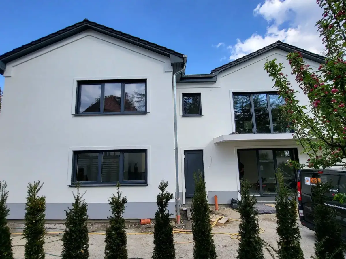 Eigentlich sollte es ein privates Wohnhaus werden, auf einem Seegrundstück in Zeuthen. Der Bauherr entschied sich anders und bestellte ein Wohnhaus mit 4 Wohneinheiten, daraus machten wir ein Zwillingshaus mit seitlichem Eingang.