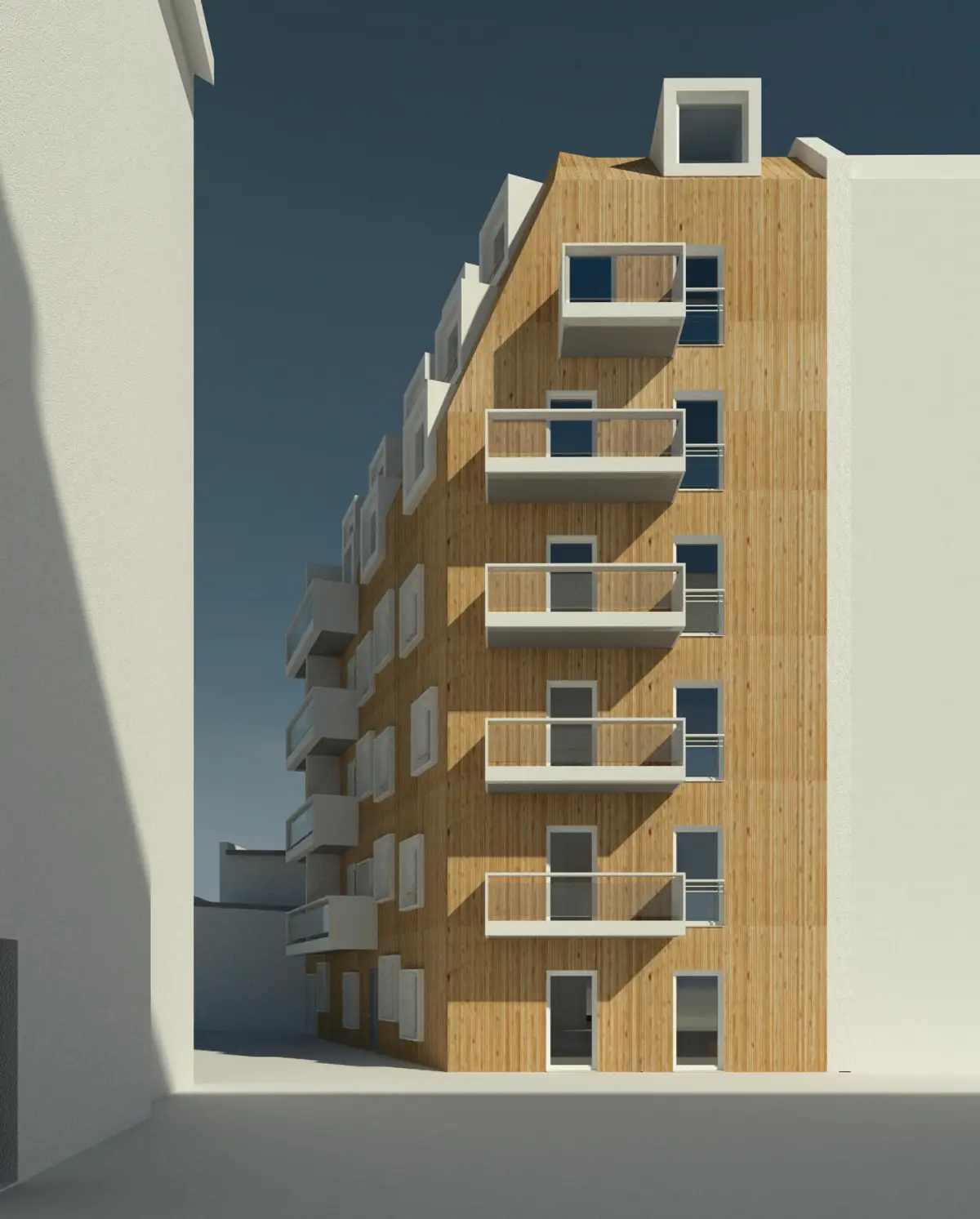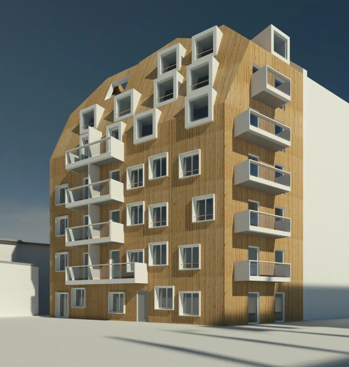 Daher haben wir auf einem neuen Grundriss, an die Brandwand der Nachbarbebauung anschließend, einen Neubau geplant, der unter der Hochhausgrenze eine Vielzahl von barrierefreien Wohnungen zulässt.