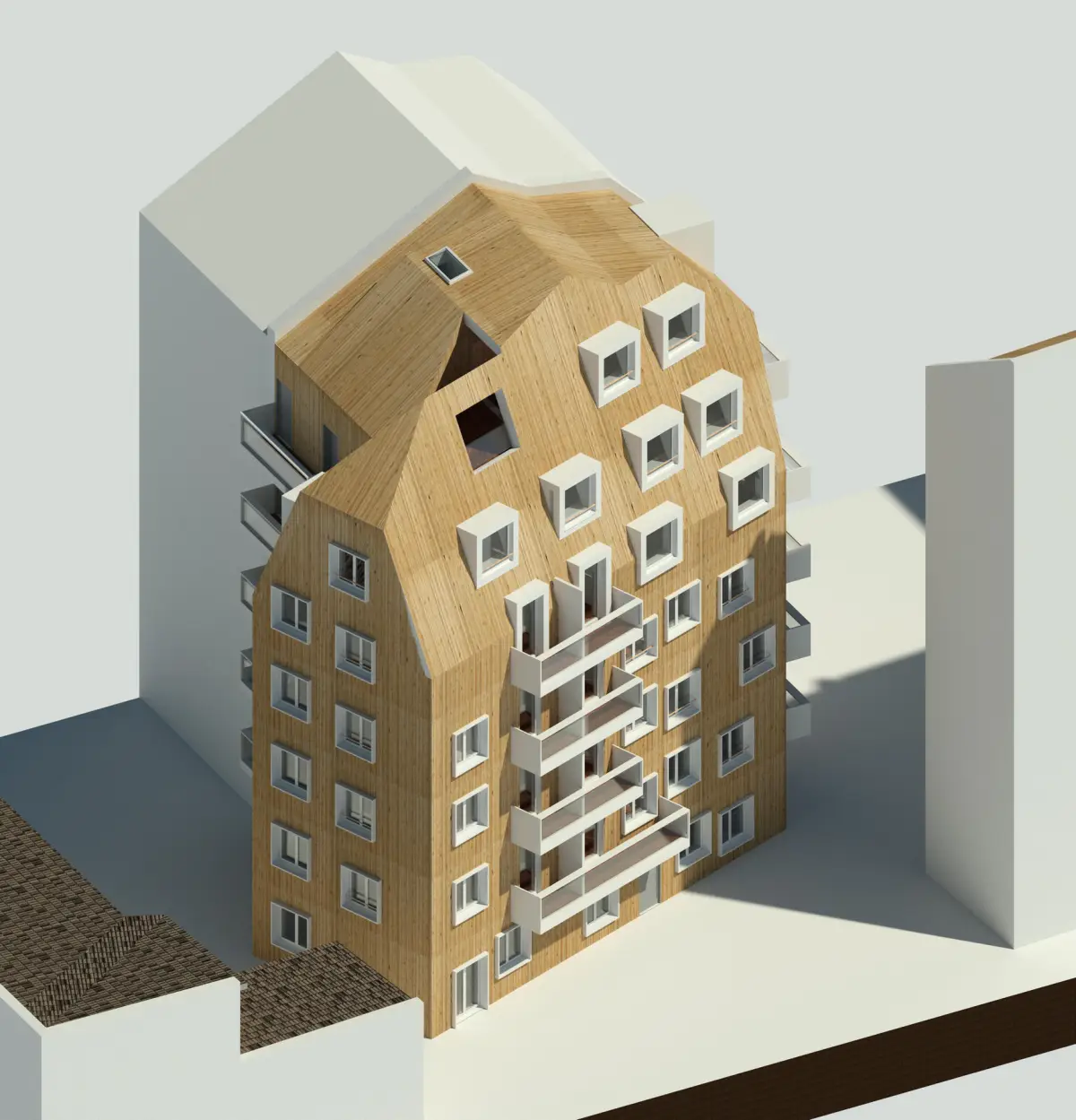 Äußerlich erinnert wenig an einen klassischen Hinterhofneubau. Mit freien Formen und einer differenzierten Fassade aus Holz, metallischen Dacheindeckung und heraustretenden Fenstern besteht Baurecht für ein spannendes Projekt.