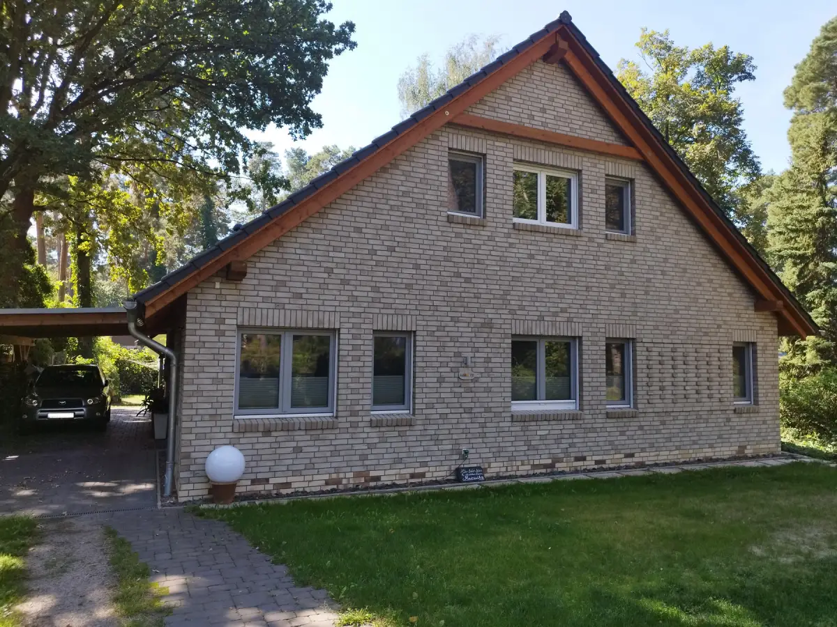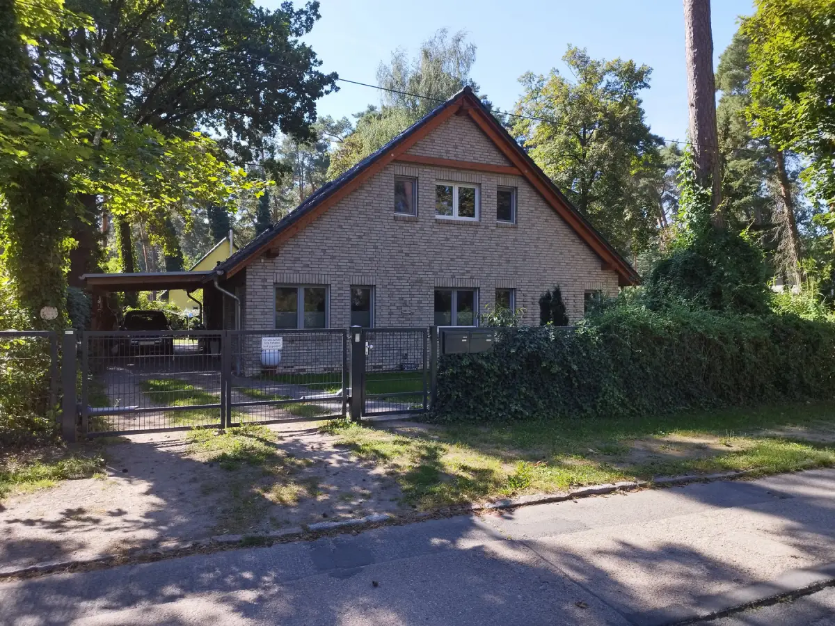 Auf einem Grundstück in guter Lage von Zeuthen haben wir ein Wohnhaus mit einer Einliegerwohnung im Dachgeschoss geplant. Das Gebäude haben wir in Ziegelmauerwerk mit einer Vormauerschale geplant, damit spielt das Licht der hohen Kiefern besonders schön mit der Fassade.