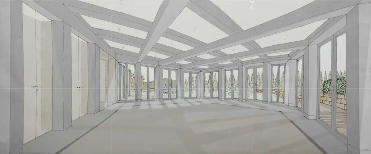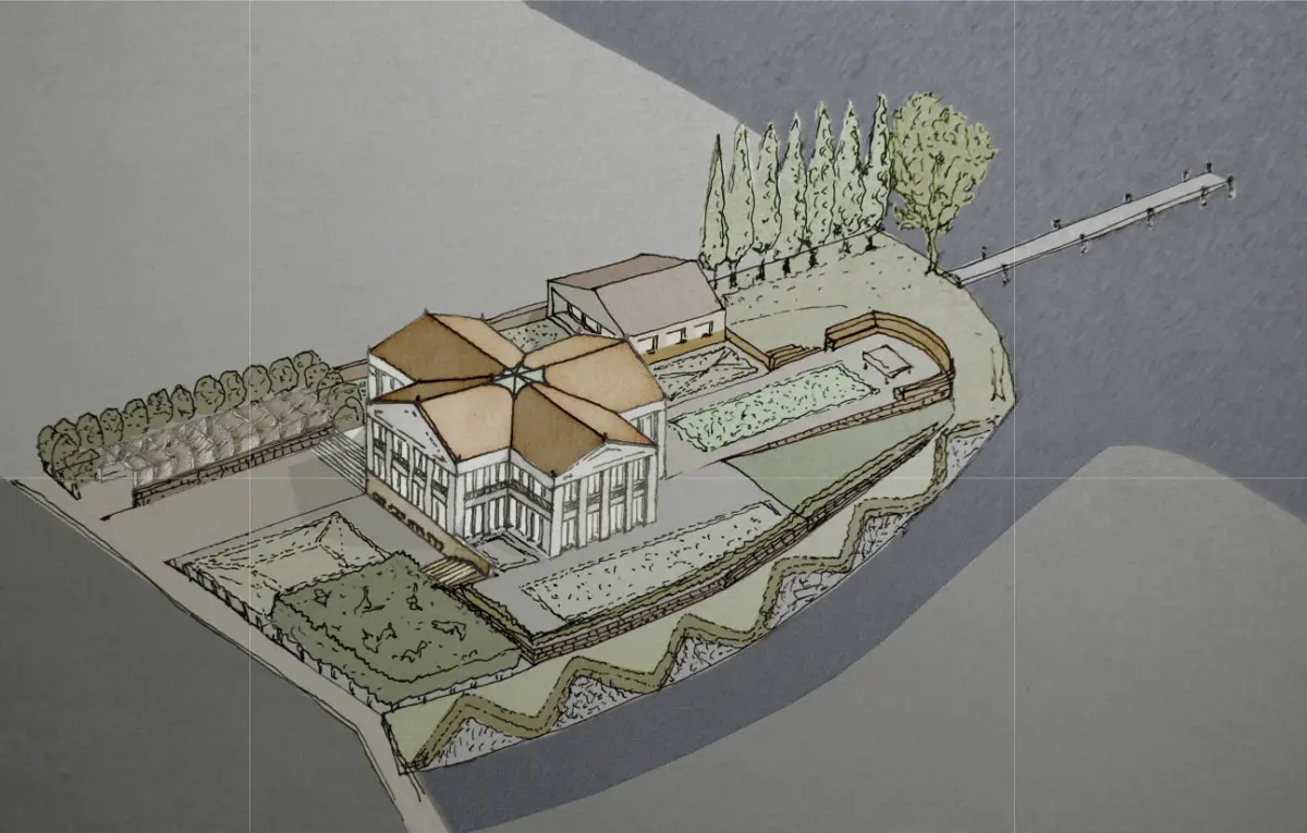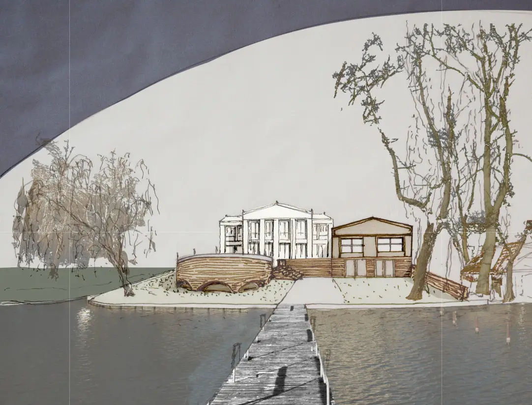 Aufgabe war ein Konzept für die Neugestaltung eines am Wasser liegenden Anwesens für privates Wohnen und gesellschaftliche Anlässe. Von der Straße aus sollte das Grundstück möglichst wenig einsehbar sein. Entstanden ist ein kreuzförmiger Zentralbau als Wohnhaus mit unterschiedlichen Funktionen in den einzelnen Flügeln und nebenstehendem Gesellschaftshaus.
